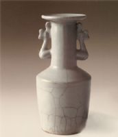 鳳首耳瓶形體規(guī)整。施粉青釉,釉層滋潤、淳厚。肩部以下呈現(xiàn)冰裂紋。淺盤口、高頸、折肩、筒腹,下部微斂,臥底。瓶頸部飾對稱鳳首耳。