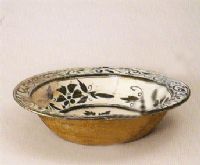 圓口,扳沿,平底。盆內(nèi)施白釉,外施褐釉?谘乩L黑彩卷草紋一周,腹及內(nèi)底繪折枝牡丹紋。