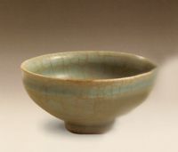 此碗為衢州南宋咸淳十年史繩祖墓出土。束口,弧腹斜收,小圈足。該碗通體施梅子青釉,釉色均勻,有極細淺紫色線狀開片,圈足露胎處朱砂底足。