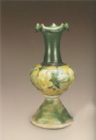 瓶口翻捲五瓣花式,細(xì)長頸,圓鼓腹,喇叭形圈足。腹部刻一周花卉紋,施黃、綠、白三種釉色。頸部施深綠色釉,釉面有細(xì)碎開片紋。