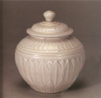 直口圓唇,下腹較短略鼓,平底,圈足,足沿很淺,底心刻寫[官]字款。蓋為圓形,蓋沿外折,中間為寶珠狀圓鈕;蓋頂做得較大,分多層次刻劃紋飾,蓋面以弧線形排列菊瓣紋為主,罐肩部亦為菊瓣紋,腹部為三層蓮瓣紋,中間以弦紋隔開,豐富了整體裝飾,統(tǒng)一而有變化。
