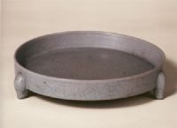 直口,底坦平,下承以三乳足,造型規(guī)整簡練。里外施談天青色釉,釉層開細碎片紋,外底有五個細小支釘痕,傳世僅此一件。此種洗似應(yīng)與三足奩配套使用。