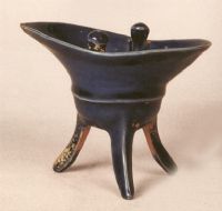 仿古銅器爵,有流、尾、敞口。一端圓,一端尖,以便酌酒,口上有兩圓柱,比銅爵杯上所見的要矮些。腹部有圈,高出一圍,高尖足呈三角稜形狀向外推出,腹底無釉色,整個爵杯胎骨薄,釉腴潤,色艷藍(lán)如寶石。