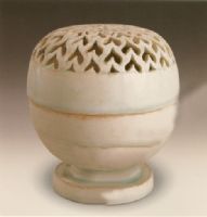 薰扁球形,子母口,高圈足。薰蓋鏤出一朵盛開的菊花。菊瓣的間隙被巧妙地留作薰孔。器內(nèi)無釉,器外滿施青綠色釉,胎堅(jiān)密白細(xì)。該器融實(shí)用與裝飾于一體,釉質(zhì)晶瑩溫潤,雅潔優(yōu)美,系景德鎮(zhèn)窯產(chǎn)品。