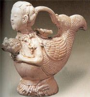 壺身作魚龍形,頭部中空為流,魚尾部上翹,背上有蓮瓣形壺口。腹刻雙翼。人首為少女頭像,發(fā)飾雙丫髻,頸部飾飄帶,腕帶手鐲,雙手捧龍頭短注,圈足兩側(cè)塑有龍爪。
