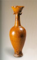 六曲花式杯口,細(xì)長頸,豐肩瘦腹,脛部內(nèi)收,臥足外展。粉紅色陶胎,細(xì)膩堅硬,上白色化妝土,滿施黃釉,底部露胎。杯口下塑貼鳳首。