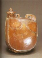 扁身雙孔,塔式蓋,凹底。因壺的上部有雞冠狀的孔鼻故名,亦稱馬鐙壺。器身飾有仿皮囊縫合針腳紋,在斷代上一般多以壺身保留皮囊祖型程度多少來推定時(shí)間早晚。