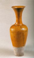喇叭口,細(xì)長(zhǎng)頸,豐肩瘦腹,脛內(nèi)收,臥足。黃白陶胎,上白色化妝土,施低溫黃釉。