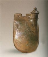 扁體高身,管狀口,塔式蓋上施寶珠鈕,馬鞍狀雙孔系,橢圓形底內(nèi)凹,淡紅色陶胎,上白色化妝土,滿施綠色低溫鉛釉,底無釉。兩側(cè)飾貼仿皮條裝飾并附有縫合痕跡,雙面劃葡萄紋,紋飾精巧別致,雙孔飾劃旋渦紋。