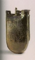 扁腹,管口圓唇,馬鞍狀雙孔系,小平底,微內(nèi)凹。紅陶胎,掛白色化妝土,施綠釉,底無(wú)釉。壺兩側(cè)面飾皮頁(yè)縫合裝飾,劃下垂的卷云紋,馬鞍形雙孔處塑一人物,呈駕馭狀,反映了騎馬民族的風(fēng)貌。