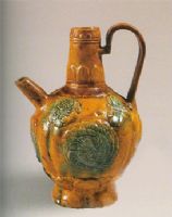 長直口,豐肩鼓腹,脛內收,肩前置短直流,后置扁曲把,圈足。灰陶胎,三彩釉,口沿下印兩周弦紋和一周仰蓮瓣紋,頸基處印仰、覆蓮瓣紋兩周,肩印兩只蝴蝶和兩組團花,腹部印四組團鳳紋作為主題紋飾,脛印一周仰蓮瓣紋。