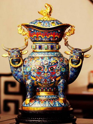 景泰藍(lán)的制作既運(yùn)用了青銅和瓷器工藝、又溶入了傳統(tǒng)手工繪畫(huà)和雕刻技藝,堪稱(chēng)中國(guó)傳統(tǒng)工藝的集大成者。它出身高貴,氣質(zhì)典雅,工藝精美,歷來(lái)專(zhuān)供皇宮貴族收藏享用、作為權(quán)力與地位象征的珍貴藝術(shù)品,民間極少得見(jiàn)。純手工制作的景泰藍(lán),因?yàn)榫疤┧{(lán)的工藝及其復(fù)雜,須經(jīng)過(guò)錘胎、掐絲、填料(琺瑯釉)、燒結(jié)、磨光、鎏金等多幾十道工序,每項(xiàng)工藝都有很高的要求,學(xué)會(huì)全部工序需要30年,而許多人只能掌握其中2-3道工藝,尤其是像《牛轉(zhuǎn)乾坤》這類(lèi)胎型厚重,器型復(fù)雜的景泰藍(lán),制作難度更高,非一般工藝匠可以完成,因此一件高水準(zhǔn)作品的誕生所耗費(fèi)的人工,幾乎無(wú)可估量。資料顯示,從事景泰藍(lán)創(chuàng)作50年的張同祿是目前唯一一位全面掌握景泰藍(lán)創(chuàng)作設(shè)計(jì)和生產(chǎn)工藝技術(shù)流程的專(zhuān)家,故被譽(yù)為“景泰藍(lán)第一人”。其創(chuàng)作的《牛轉(zhuǎn)乾坤》,經(jīng)過(guò)塑形、鑄造等38道精致復(fù)雜的純手工工序制成,主題突出、寓意深遠(yuǎn)、造型端莊富麗、釉面瑩潤(rùn)如玉,完美展現(xiàn)出銅與火的藝術(shù)魅力,被業(yè)內(nèi)譽(yù)為“代表當(dāng)代中國(guó)景泰藍(lán)技藝的最高成就”。