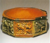 胎呈紅色。器呈八角柱形,平底。內(nèi)口為圓形,圜底。外壁八面皆浮雕西亞人戲獅紋,黃褐、綠色彩釉相間排列,內(nèi)壁施黃褐釉,底無釉。出土?xí)r,內(nèi)盛肉食供品。