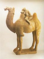侍女小憩騎駝俑出土于唐墓,陶質(zhì)紅色,原施粉彩,年久脫落。駝做站立狀,一女俑盤一足側(cè)坐于駝背上,左臂垂放于左膝上,石臂搭在前駝峰上,頭伏于右臂做睡姿。女俑身著圓領(lǐng)右袵長袍,下著褲,足蹬長靴,髮辮左右分梳,自兩側(cè)遮耳下垂,給人們展示了一幅絲路漫漫,人困駝乏的生動景象。