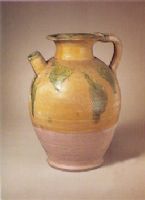 壺盤口,粗頸,短流,曲柄。于釉下涂白色化妝土,施半截釉,坯胎上拍印蓆紋,釉透明度高,以黃色為主,間雜綠色的斑塊,色調(diào)明快、艷麗。釉下蓆紋的運用,使光素的器物產(chǎn)生出一種錯落有致的3節(jié)奏感,簡單的拍印方法又適于大量生產(chǎn),故被南北各地瓷窯普遍采用,成為唐代一種普遍流行的裝飾手法。
