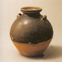 盤口、短頸、溜肩,肩下部飾對(duì)稱雙擊系,鼓腹下收,平底。胎質(zhì)略呈鐵紅色,留有輪制痕跡,施半釉,釉色不太均勻。婺州窯歷史悠久,早在四千多年前就燒制陶器,此盤口壺為唐代婺州窯產(chǎn)品。