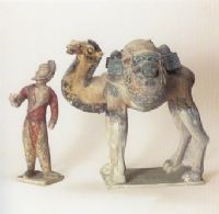 駝通體彩繪,伸頸揚(yáng)頭,駝背上鋪有橢圓形花邊毯子,駝架上橫置紋飾華麗的絲綢袋囊,兩側(cè)掛著扁壺、山雉、野兔、刀鞘、箭囊等物,一變機(jī)靈、調(diào)皮的小猴爬在馱袋上,似在玩耍。俑深目虬髯,身著鮮艷的翻領(lǐng)胡服,側(cè)身站立,昂首挺胸,手作牽拉狀。這一組人物生動(dòng)地反映了當(dāng)年絲綢之路上的運(yùn)輸情