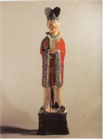 頭戴鳥(niǎo)飾冠,長(zhǎng)袍曳地,雙手執(zhí)圭拱手胸前,肅穆恭立,舉止文雅,顯示出唐代文臣的端莊形象。