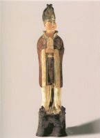 李貞是唐太宗李世民的第八個(gè)兒子,被封(越王),因反對(duì)武則天兵敗自殺。唐玄宗開元六年(公元七一八年)詔陪葬昭陵,該墓出土文官俑兩件。此俑頭戴高冠,套翻領(lǐng)交襟右衽廣袖外衣,腰束帶,身體稍仰,雙手執(zhí)供于胸前。