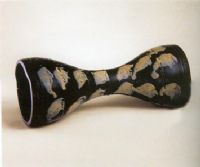 河南魯山縣段店窯制品,腰鼓呈長(zhǎng)形,兩端粗大,中間細(xì)成凹形,中空。鼓身凸起弦紋七道,裹外施黑釉,外部釉面散佈著幾十塊大斑點(diǎn),斑點(diǎn)由乳白,茄紫,灰藍(lán)等色組成,宛如黑色閃緞的彩色裝飾,靜穆而典雅。