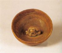 該碗施褐釉,深灰色胎,環(huán)底。碗內(nèi)下腹部施有弦紋兩道,弦紋下至碗底用深褐色彩,點(diǎn)畫(huà)成水波紋加以裝飾。碗內(nèi)底堆塑一雙魚(yú)鷹,用腳爪站在一尾鯉魚(yú)身上,鯉魚(yú)張嘴翹尾,魚(yú)鷹側(cè)首凝視,造型生動(dòng),自然質(zhì)樸。
