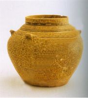 體形碩大。高領(lǐng),階梯狀厚肩,圓鼓腹下收,平底。上腹部置六個(gè)半圓形系,系與肩交接處呈鴨蹼狀。施青釉,釉呈黃色,有流釉現(xiàn)象,積釉處呈醬褐色,釉面光亮。造型凝重