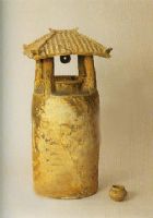 青瓷水井,為筒式,短頸、豎口,窄平肩,肩端有四柱,承頂一個五脊垂檐四面坡的瓦蓋。瓦蓋內(nèi)正中有一滑車狀的附件,中有孔,供提水穿孔繩索之用。