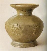 青瓷唾壺,喇叭口,矮束頸,扁圓腹,腹下內(nèi)收,圈足外撇,肩腹際飾;兩周刻劃弦紋,腹部排列六處模印堆貼紋飾,一為仙人騎神獸,一為祥云朱雀,兩者間隔而置,兩兩相對(duì),裝飾效果頗類(lèi)浮雕。除器底外,通體施青黃釉。