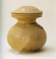 青瓷帶蓋唾壺,橢肩圓腹,盤口,淺圈足,口上覆一子口器蓋,蓋形如一倒扣的撇口折沿圜底小碟,蓋沿與盤口齊平,兩者相扣頗為嚴(yán)闔。器腹上小下大,呈圓梨形,底為淺平圈足,通體施青釉色,黃綠相間,頗顯雅麗。青瓷唾壺,一般東晉以前出的多為敞口,帶蓋并帶托的唾壺多見于南朝,而這件唾壺則出于鄂西何田埠的東晉墓中,卻有蓋而無托,表現(xiàn)出由東晉向南朝演變發(fā)展的序列。