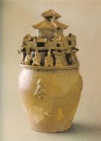 整器由蓋、罐兩部分組成。蓋仿重檐樓閣式建筑,創(chuàng)角飛翹,氣勢宏偉。瓶口為圓形,與蓋底相吻合。頸肩部作出兩層寬檐,上層堆塑亭臺、樓閣,下層為伎樂胡人,各具姿態(tài)。腹部堆塑人物禽獸等。此器集多種題材的裝飾為遺體,構(gòu)圖復(fù)雜,寓意深刻,不失為一件藝術(shù)珍品。
