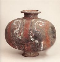 壺腹呈繭形,故名。敞口,束頸,圈足外侈,周身施黑陶衣,繪紅、白相間的渦捲云紋圖案,舒捲自如,給人以古樸、莊重、鮮麗之感。該種壺類多為秦、漢之際流行於關中及豫西一帶的器皿造型。