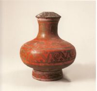 鍾為敞口,細(xì)長頸,鼓腹,圈足。有碟式小蓋。自頸至足,以白、紅色彩繪出圓點、幾何、抽象人物等圖案。鍾即圓形壺,用以盛裝酒漿或糧食,盛行於漢代。陶鍾是仿照銅鍾制作的明器。
