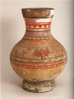 灰陶胎,橙黃陶衣。敞口,束頸,鼓腹,平底假圈足?谥粮挂院凇⒅觳书g隔,填鋸齒紋、波狀紋、三角云紋。最醒目的是主題紋飾,區(qū)間闊大,飾流云紋,云中有斑虎、神獸、顯得陶壺愈加古樸端重。
