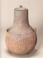 這件壺的器表呈土黃色,生燒,造型很別致。肩部與近底處,均飾弦紋,弦紋之間,加飾篦紋。