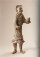此俑服裝是漢代武士的標(biāo)準(zhǔn)裝束,頭戴巾,過兩頰系結(jié)於頦下,身著兩重衣,均交領(lǐng)右袵,外衣綠色,內(nèi)衣紅色,衣長及膝,腿扎行縢,足蹬齊頭履。雙手彎曲前伸,兩站丁字步,目光專注,嘴微啟。