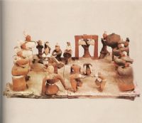 這是一件陶塑組雕,它成功地塑造了二十多個人物群像,突出樂舞主題和雜技的高難度技巧,神態(tài)逼真,動靜統(tǒng)一,主次分明,有聲有色,十分可貴。