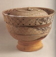 簋為紅陶質(zhì),雙唇子母口,內(nèi)外唇敞口,高圈足,附蓋,蓋面飾以一道凸弦紋把蓋面分為兩部份,凸弦紋上飾三點(diǎn)附加堆飾。