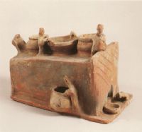 竈呈長方形,紅陶質(zhì),燒制火候不高。竈身飾刻劃方格紋。前有火門,后有煙囪突出。竈面有三眼置三釜,旁置兩缸。