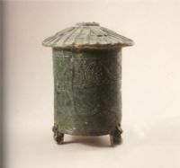 陶囷為圓桶狀,有蓋,蓋上有脊和瓦壟,中間有圓孔。底有獸形三足。腹部雕刻出突起的龍紋,云氣紋,通體施綠釉。模型明器陶囷在陜西鳳翔戰(zhàn)國時期的秦墓中就已經(jīng)出現(xiàn),秦、漢時期的墓葬中更為多見,形狀也有圓形平底囷、圓形三足囷、圓形四足囷等多種,其中圓形三足囷是漢代較為常見的一種類型。