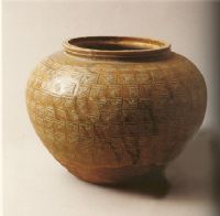 直口,矮頸,鼓腹,平底。器身佈滿由杉葉紋所組成的方塊紋。施淡褐色釉。器物的造型和紋飾都脫胎於印紋陶。與之同類型有青瓷產(chǎn)品見於上虞小仙壇東漢窯址。