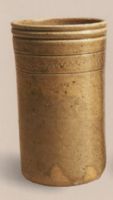 杯呈圓筒狀,直口圓唇,平底。近口沿處飾上下兩道內(nèi)凹紋,其下,兩道弦紋中隱刻一周水波,共同組成一圈紋飾帶。