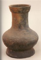 盤口,口部與頸部相接處做成兩層臺階,直頸,扁鼓腹,腹上飾以兩道弦紋,腹下部內收,喇叭狀圈足。此器為灰陶制品,胎質較為疏鬆,器型為典型的漢代制品,在當時,亦見施以鉛綠釉的此類作品,為漢代流行器物。