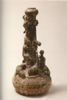 口似蒜頭,細(xì)長(zhǎng)頸,鼓腹,平底。頸上部塑有數(shù)只鳥,似在啄木,另塑有一只頑皮的猴子,似從樹上往下爬,邊爬邊做著各種怪像。頸下部塑有一人,懷抱[大樹],露著微笑。