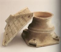 此井為灰陶質(zhì),井蓋與井身分開(kāi),井身呈罐形,井口平緣,折肩,腹部有一道凸弦紋裝飾,底緣呈四方形,四角各割去一小角,四角上各有一洞,應(yīng)為放置支撐井蓋的木條所用。
