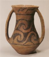 敞口、長(zhǎng)頸、扁圓腹、平底,頸與腹間有對(duì)稱(chēng)大雙耳。器表施紅色陶衣,用黑彩繪出相連接的漩渦紋。造型精巧,裝飾華麗。
