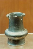 敞口,長(zhǎng)頸,扁腹,喇叭形圈足,足部有雙孔。雙貫耳。器表烏黑發(fā)亮。