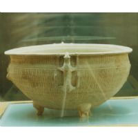 為大件器型。平沿、深腹,底置三足,外壁對稱塑有伏螭虎。器表光亮,施釉不均,腹壁飾有戮印紋。