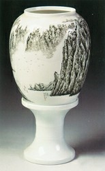 楊先生的瓷刻作品傳世之作稀少,如今僅能從上海工藝美術(shù)研究所藏品中見到。其中瓷刻山水作品的意義在于刻出極強(qiáng)的中國(guó)畫畫意和筆法(如圖)。觀看整個(gè)瓷刻作品,似乎是在觀賞一幅傳統(tǒng)的中國(guó)山水畫:皴、擦、染、點(diǎn),都有細(xì)膩的表現(xiàn);筆墨設(shè)色濃淡相宜,渲染有致,所有的刻畫都顯現(xiàn)出中國(guó)畫特有的筆法,似乎都沒有了刀痕的蹤跡,令人嘆為觀止。