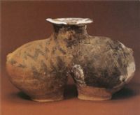 小口,寬沿外侈,短頸,扁圓腹中間下部有夾角襠,把下腹部一分為二,并各有一個假圈足。器表似塗有一層細(xì)泥陶衣,并用黑彩在兩腹表面分別繪制出曲折紋與菱形紋。造型奇特,彩繪華麗。