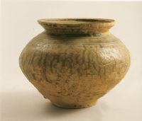 敞口,短頸內收,圓肩,深腹圓鼓,平底。肩部飾弦紋與乳釘紋,腹部滿飾變體云雷紋。器表施青綠釉。